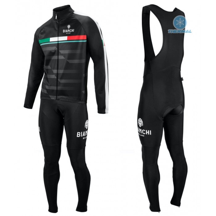2019 Bianchi Milano FT Zwart Thermal Fietskleding Set Wielershirts Lange Mouw+Lange Wielrenbroek Bib..